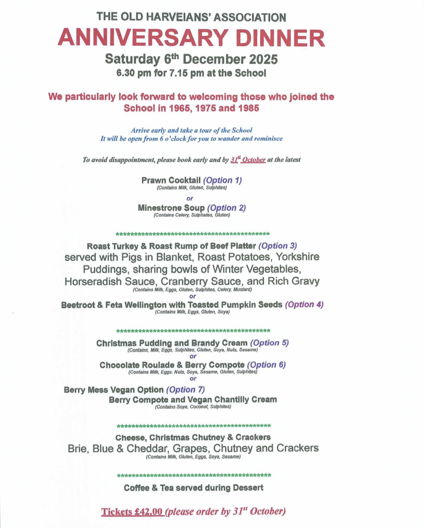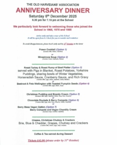 The OHA has a unique and close relationship with the School. The Harvey does not have a Parent Teachers Association and the OHA provides the important fund-raising that is usually done by a PTA. In recent years these funds have provided a new mini-bus, re-stocked the Library and sent all Year 9 pupils to Ypres war graves each year during the WW1 commemorations. This is why your membership and subscription is so important. The Association produces a regular Newsletter and has an active social calendar. The first Saturday in December always sees the OHA Annual Reunion Dinner at the School, which invariably attracts a large gathering and is a focus for the year-group reunions. We hold occasional luncheons with distinguished speakers, a Concert each March as well as running trips to places of interest.